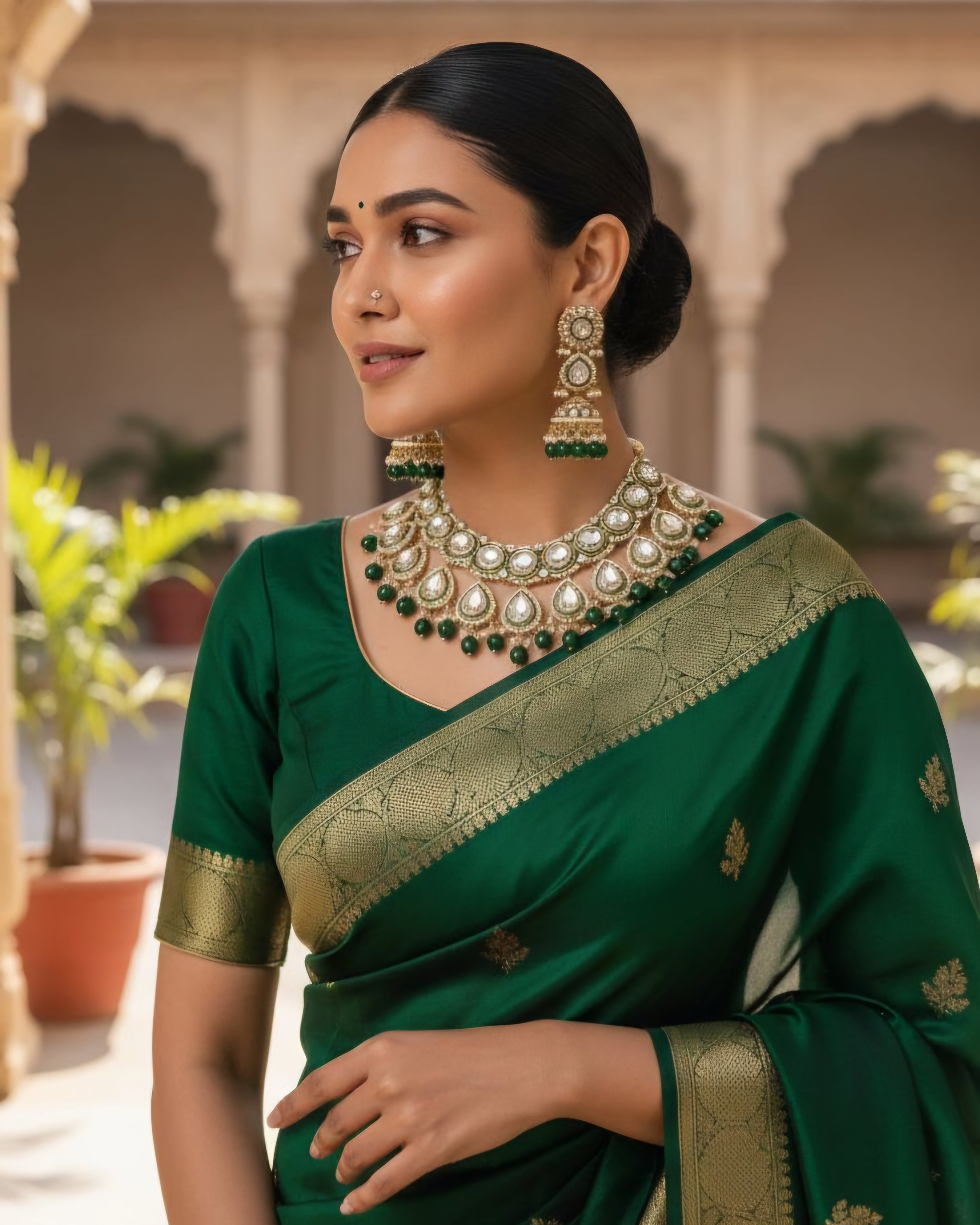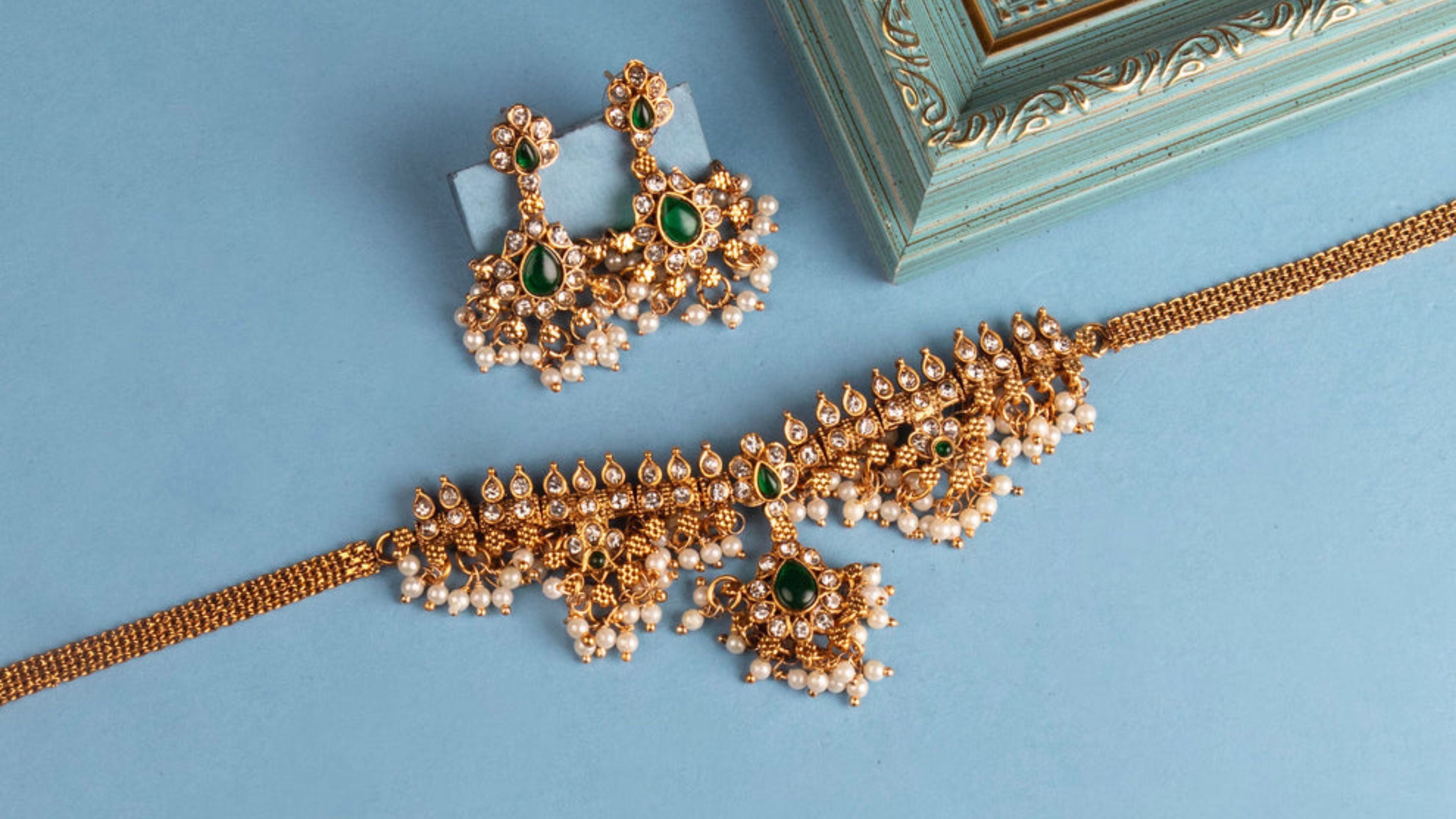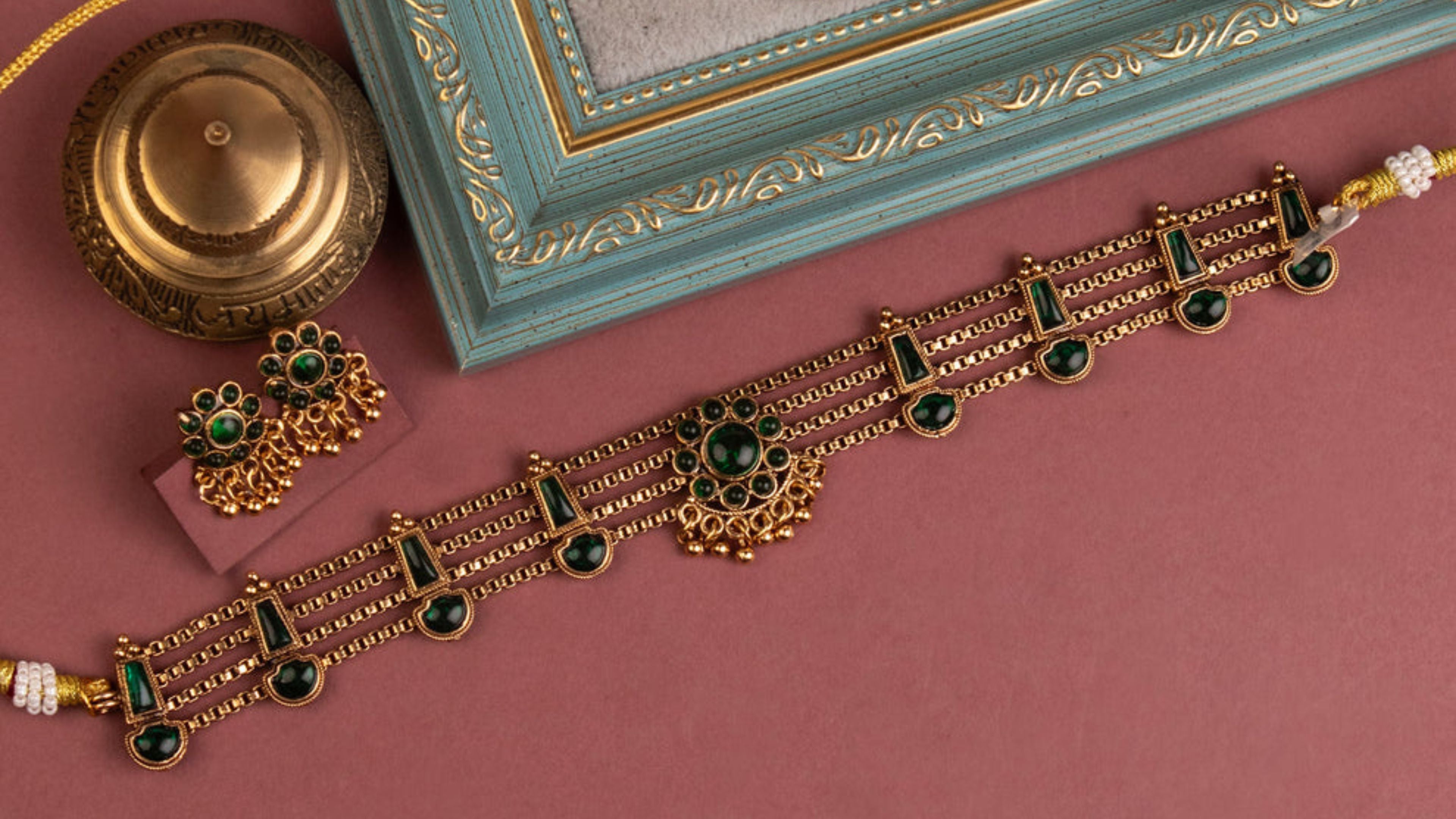 Royal Emerald Blossom South Indian Choker Necklace Set – Matte Gold Finish